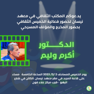 يسر المكتب الثقافي في معهد نيسان دعوتكم لحضور فعاليات الخميس الثقافي وذلك بحضور المخرج والمؤلف المسرحي الدكتور اكرم وليم استاذ في كلية الفنون الجميلة للحديث عن تجربته الفنية والمسرحية الكبيرة وسيكون ميسر الجلسة الاستاذ حسين علي المنصوري.