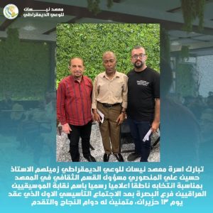 تبارك اسرة معهد نيسان للوعي الديمقراطي زميلهم الاستاذ حسين علي المنصوري مسؤول القسم الثقافي في المعهد بمناسبة انتخابه ناطقا اعلاميا رسميا باسم نقابة الموسيقيين العراقيين فرع البصرة بعد الاجتماع التأسيسي الاول الذي عقد يوم ١٣ حزيران، متمنين له دوام النجاح والتقدم.